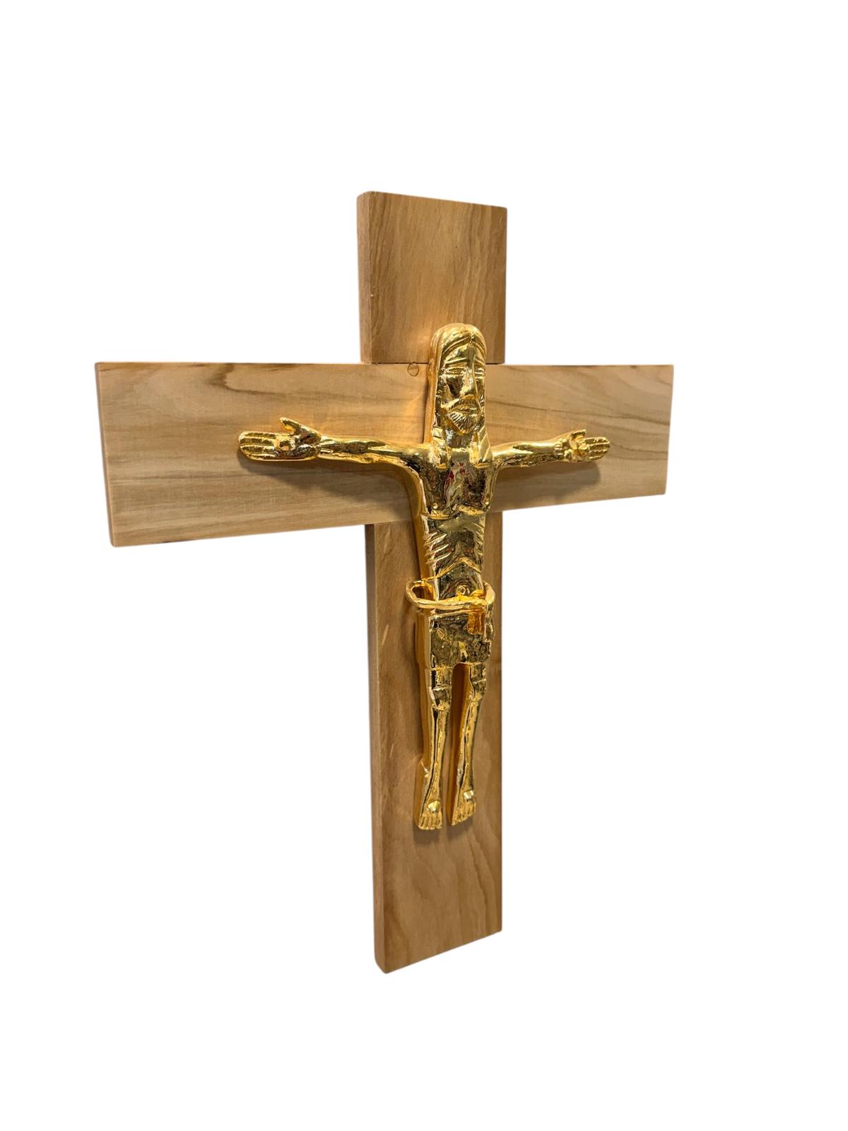 Cruz de pared,  hecha con madera de olivo. Cristo de metal dorado con baño antioxidante.